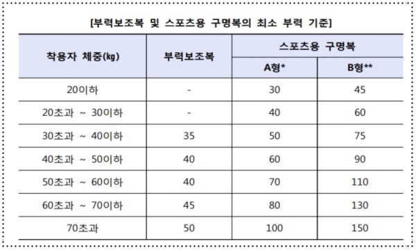 부력보조복이라는 것도 구명조끼 일종이긴 합니다. 하지만 이 구명복은 보호시설이 없는 곳에서 사용하면 위험하고 특히 30kg 이하 어린이에게는 판매가 금지되어 있습니다. 하지만 인터넷 또는 일반 매장에서도 이 부력보조복이나 수용보조용품을 어린이 구명복으로 판매하고 있어 오해하고 구입할 수도 있습니다.