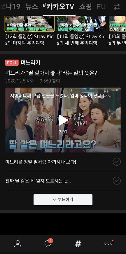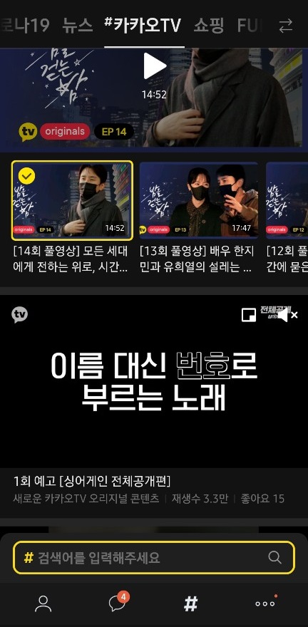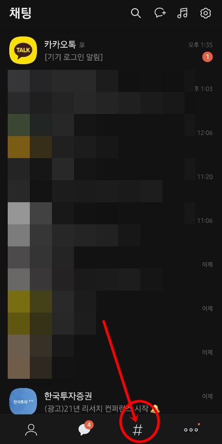 카카오톡에서 카카오티비 보는법 으로는 카톡을 열고 아래의 #을 눌러주세요. 그리고 상단에 #카카오TV라고 적혀 있는 부분을 터치하면 영상이 나옵니다.