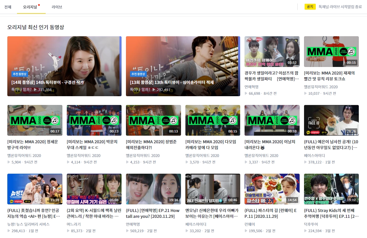 포털사이트에서 카카오티비 검색하면 바로 카카오TV사이트로 들어갈 수 있습니다. 홈페이지에서도 오리지널과 라이브로 나뉘어져 있고 전체를 다 한번에 확인할 수도 있습니다. 요즘 인기있는 며느라기 등을 보고 싶다면 오리지널 선택하면 됩니다.
