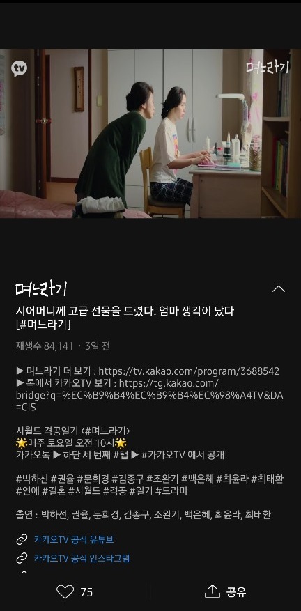 TV 항상 켜놓고 보거나 하진 않습니다. 그냥 너무 조용한 건 싫고 음악을 들으면 너무 푹 빠지는 경향이 있어 적당하게 시끄러울 정도로만 티비 켜 놓습니다. 그런데 요즘은 진짜 TV 프로그램 볼 만한 게 없다 싶었는데 연예계뉴스에서 며느라기? 라는 프로그램 얘기가 나오더라구요. 그리고 찐경규 뭐 이런 프로그램도 있고 해서 어디서 하는 건가 했더니 바로 카카오티비 라고 합니다. 어떻게 보는건지 보는법 저도 지금 따라해 보고 있습니다.
