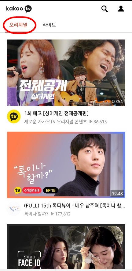 플레이스토어에서 어플을 다운받으면 바로 볼 수 있습니다. 어플을 이용할 경우는 카카오톡에서 보는 것과는 달리 드라마와 예능은 물론이고 실시간 뉴스 등도 볼 수 있습니다. 오리지널을 선택하면 카카오티비 오리지널 프로그램을, 실시간을 선택하면 시청자순 또는 방송시작순으로 또 여러가지 프로그램을 선택할 수 있습니다.