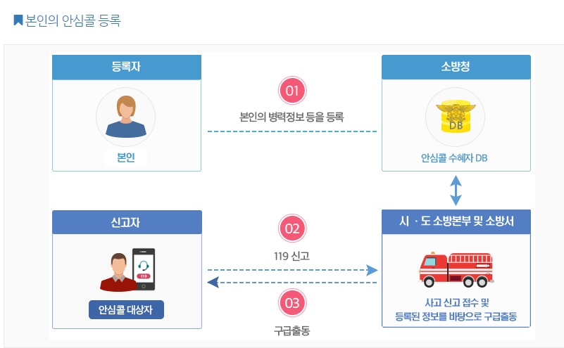 즉 119안심콜 서비스 신청해서 정보를 입력하면 그 사람의 질병과 투약기록, 특성을 알고 구급대원이 출동하게 되면서 맞춤형 응급처치와 병원이송을 할 수 있게 됩니다. 즉 환자맞춤형 응급처치가 가능한 서비스라고 볼 수 있습니다
