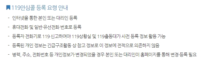 119라고 하면 무슨 문제 생겼을 때 그냥 전화만 하면 되는 건 줄 알았는데 이렇게 미리 신청 해 놓는 방법 있다는 것을 보니 우리나라도 이제 많이 안심할 수 있겠구나 싶은 마음이 듭니다.