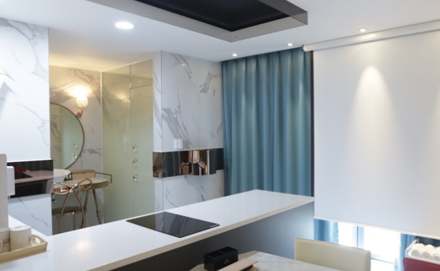 스위트룸은 기준 4명에 최대 8명, 퀸 침대 2개, 침실층과 거실층 그리고 주방층이 분리되어 있는 럭셔리 스위트룸입니다. 여수 슈가브리움 풀빌라 펜션에서 가장 규모가 큰 단독 루프탑 수영장을 보유하고 있습니다.