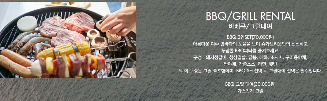 또한 이런 곳으로 여행을 가면 다들 바베큐를 하고 싶어하는데요, 오푸스11 풀빌라 펜션 에서는 그릴비 사용요금2만원과 고기세트 75천원에 여러가지를 제공해 주고 와인과 맥주도 판매하고 있다고 하니 어지간해서는 빈 손으로 카드만 챙겨가면 될 것같습니다.