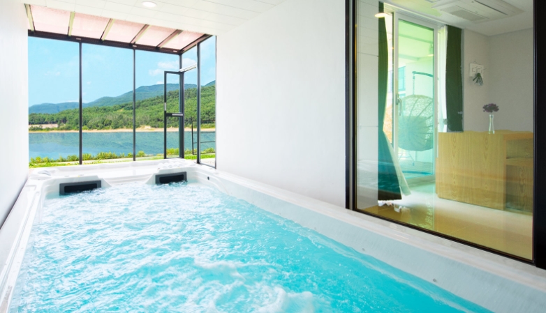 경주의 오푸스11 풀빌라 펜션 경우는 호수를 앞에 두고 있습니다. 풀빌라 타입이 5가지이며 야외수영장도 이용할 수 있습니다. 여름에는 시원하게 그 외의 계절에는 30도 정도의 미온수이기 때문에 이용하는데 크게 문제는 없을 듯 합니다.
