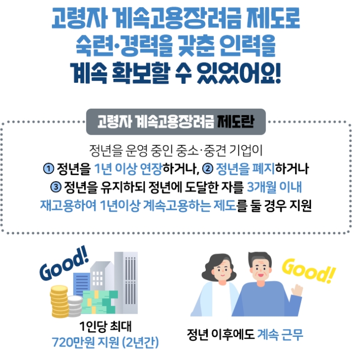2020년부터 도입된 제도로 고령자의 급속하게 진행되고 있는 고령화 사회에서 아직은 더 일할 수 있는 기회를 제공하고자 하는 제도로 정년폐지 및 정년 후 재고용제도 등을 도입한 기업을 지원하는 제도입니다. 우선지원대상기업, 중견기업이 이 정년을 연장하거나 폐지 또는 정년 후 재고용해서 60세 이후에도 일할 수 있는 계속고용제도를 도입했다면 장려금이 지급됩니다.