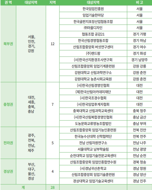 북부권 12개소, 충청권 7개소, 전라권 5개소, 경상권 4개소입니다. 각각의 전문교육기관에서는 여러가지 임업 관련 교육을 하고 있습니다. 또한 각 기관에 따라서 교육내용 뿐만 아니라 교육생 선발 방법이 상이할 수 있으므로 직접 교육기관에 문의를 해 보시는 것이 빠릅니다.