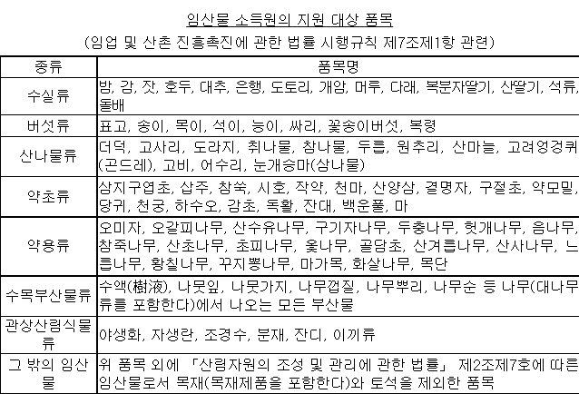 세분화 되어 있는 임업후계자 자격요건은 위의 표를 참고하시면 됩니다. 산림사업용 종자 또는 산림용 묘목 / 수실류 / 버섯류 / 산나물류 / 약초류 / 수목부산물류 / 관상산림식물류 / 그밖의 임산물 등으로 구분되어 있습니다.