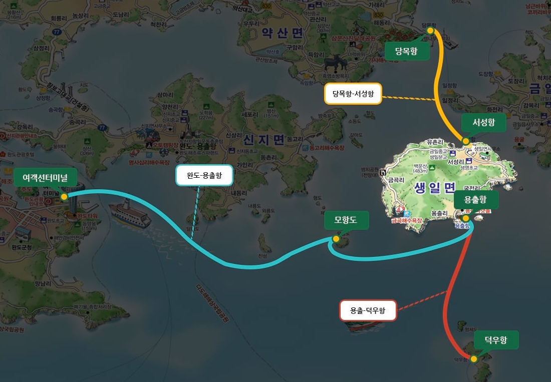 짝수일 오전 완도에서 생일도 가는길 배시간은 완도에서 8시 30분 출발해서 덕우 지나 용출에 10시 20분 도착합니다. 오후에는 완도에서 14시 30분에 출발해 용출에 15시 40분에 도착합니다.