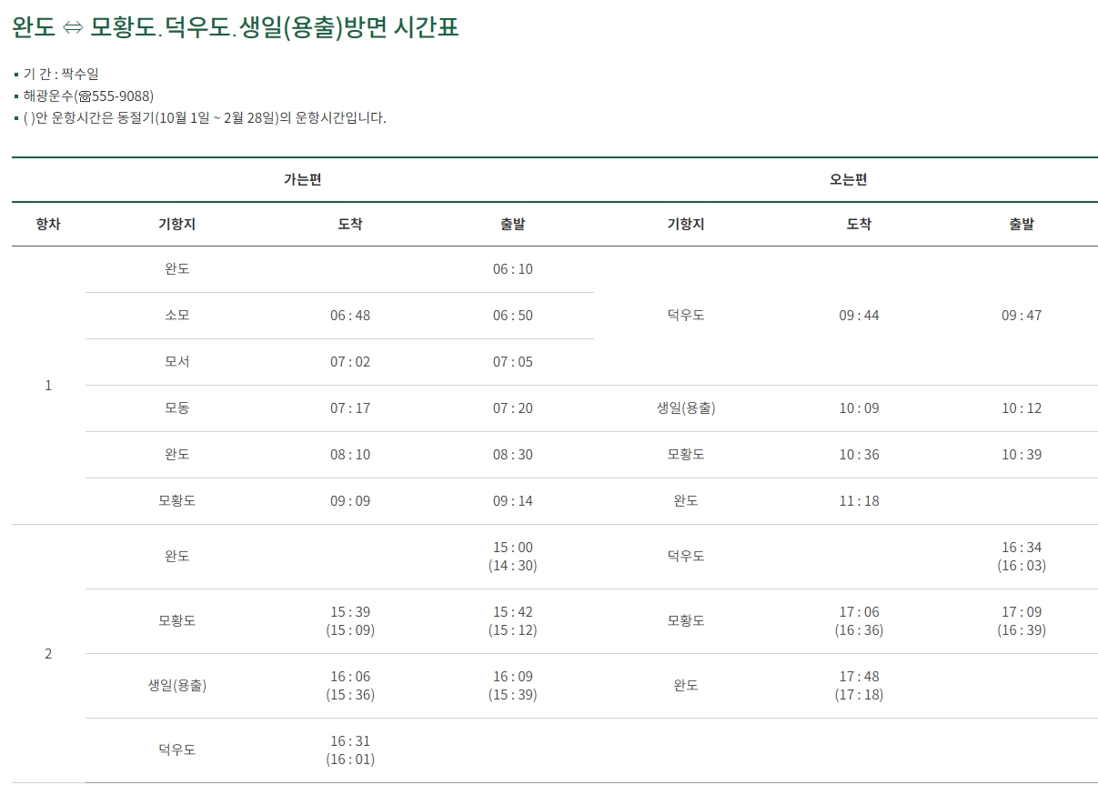 또한 완도에서 바로 생일도 들어 가는길 배시간 경우는 하루 2회 운항하고 있습니다. 홀수일과 짝수일로 나뉘어져 있습니다. 홀수일 경우 완도에서 생일도 용출항으로 가는 경우는 오전 8시 30분에 출발해서 9시 40분에 도착합니다. 그리고 이 배가 덕우, 황제, 덕우 지나서 다시 용출로 들어오는 시간이 11시 30분으로 완도로 들어가면 12시 40분입니다.