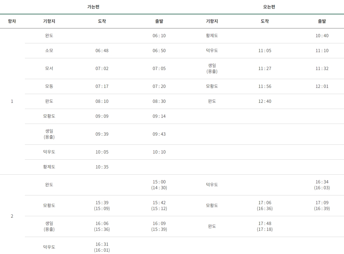 홀수일 오후 완도에서 생일도 가는길 배시간은 완도에서 14시 30분에 출발해 용출해 15시 40분에 도착, 덕우 지나서 완도로 들어갑니다.