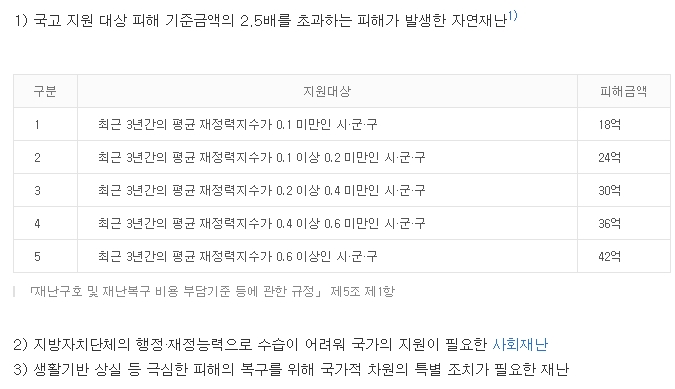 자연재난으로 재난구호 및 재난복구 비용 부담기준 등에 관한 규정, 제5조 제1항에 따른 국고 지원 대상 피해 기준금액의 2.5배 초과 피해가 발생한 재난, 말이 좀 어려울 수 있습니다만 재난으로 인해 피해액이 그 지방자치단체 재정력지수에 따른 국고 지원액이 2.5배 이상이면 특별재난지역으로 선포됩니다.