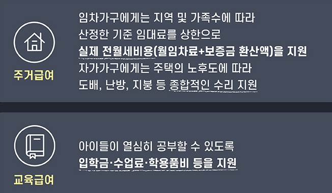 주거급여란 임차가구에게는 지역 및 가족수에 따라서 산정한 기준 임대료를 상한으로 해서 실제의 전월세비용을 지원해주는 제도입니다. 실제 전월세비용이란 월임차료에 보증금환산액을 더한 금액입니다. 자가가구이지만 주거급여를 받는 경우는 주택 노후도에 따라서 도배와 난방 그리고 지붕 등의 종합적인 수리를 지원합니다.