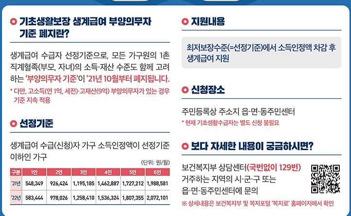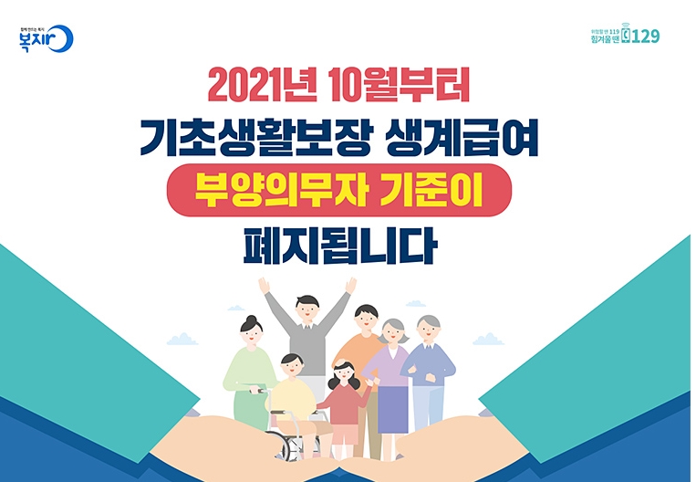 생계급여 수급자 선정기준으로 모든 가구원의 1촌 직계혈족의 소득과 재산수준도 함께 고려하는 부양의무자 기준이 2021년 10월부터 폐지되는 것입니다. 다만 부모나 배우자 포함한 자녀가 연 1억원을 초과하는 고소득, 9억원 초과의 고재산자인 경우는 생계급여 대상에서 제외됩니다.