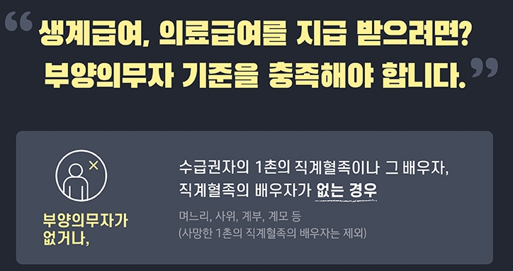 생계급여와 의료급여에는 부양의무자 기준이 있으며 주거급여와 교육급여에는 부양의무자 기준이 적용되지 않습니다. 여기서 말하는 부양의무자란 수급권자를 부양할 책임이 있는 사람이며 수급권자의 1촌의 직계혈족 및 그 배우자가 이에 해당됩니다. 다만 사망한 1촌의 직계혈족의 배우자는 제외됩니다.