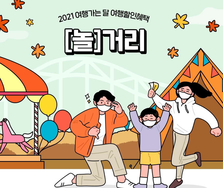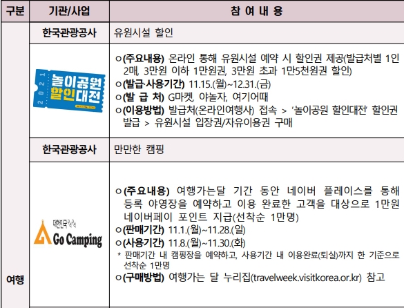 11월 여행가는 달 여행 부분에서의 할인 혜택은 여러가지로 나뉘어져 있습니다. 대표적으로 한국관광공사에서는 유원시설 할인과 캠핑에서 할인을 받을 수 있습니다. 온라인 통해 놀이공원을 예약하면 할인권을 제공받을 수 있습니다. 12월31일까지 발급 및 사용할 수 있으며 G마켓, 야놀자, 여기어때에서 발급 받을 수 있습니다.