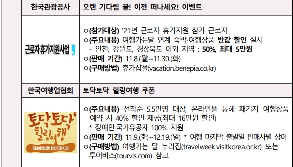 근로자 휴가지원사업으로도 11월 여행가는 달 할인을 받아볼 수 있습니다. 2021년 근로자 휴가지원 참가 근로자는 여행가는 달 프로그램과 연계된 숙박과 여행상품을 반값 할인 받을 수 있습니다. 인천과 강원도, 경북 이외의 지역에서 최대 5만원 50% 할인을 받을 수 있습니다.