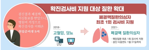 일반 성인의 건강검진 항목에 미세먼지로 인한 건강문제를 고려해 폐기능검사가 도입될 예정이며 또한 만성질환과 관련되어 나타나는 안과질환 예를 들면 당뇨망막병증 등의 의료 부담을 완화시키기 위해 안저검사도 도입할 것을 검토합니다.
