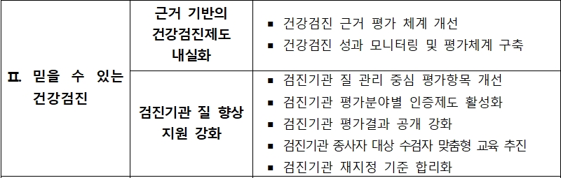 2. 믿을 수 있는 국가건강검진 추진 - 신뢰성을 강화해 건강검진제도의 내실화와 항목과 질의 향상을 위한 지원을 강화할 예정입니다.