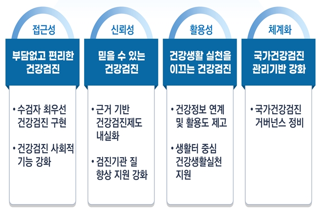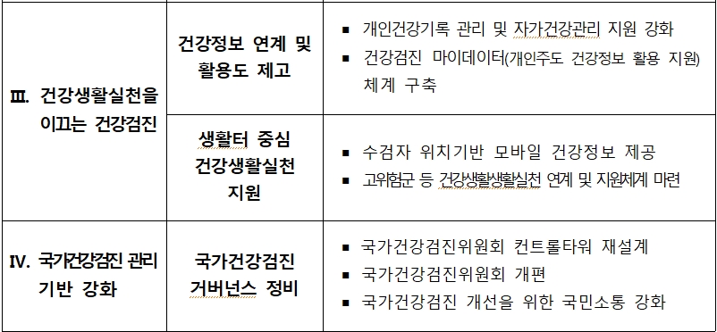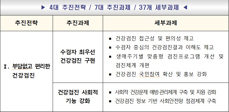 1. 부담없고 편리한 국가건강검진 추진 - 국가건강검진 대상자를 최우선으로 한 검진을 구현하기 위해 접근성과 편의성을 고려하고 생애주기별 맞춤형 검진 프로그램 개선 및 체계를 개편할 예정입니다.