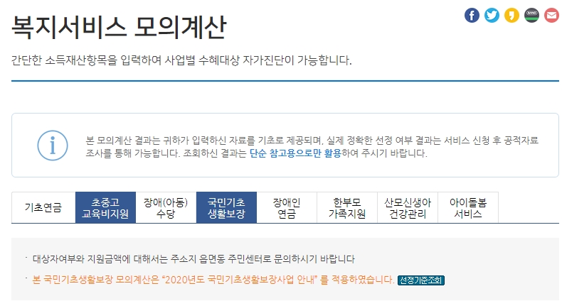 기초생활수급자 자격요건 알아보기 위해 위의 계산을 한다는 것은 사실 어렵습니다. 따라서 복지로 홈페이지에 들어가면 복지서비스 모의계산할 수 있습니다. 국민기초생활보장란을 선택해서 자신의 정보를 기입해서 확인해보면 됩니다. 예를들어 1인 가구로 소득인정액이 150,000원이라면 1인가구 생계급여 지급기준인 527,158원 - 소득인정액 150,000원 = 377,160원을 생계급여비로 지급받게 됩니다.