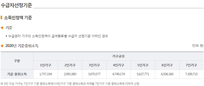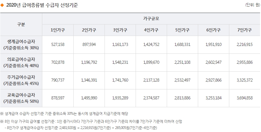 2020년 기준중위소득이 기준이 되어 아래와 같이 가구원수에 따라 중위소득액이 산정되었습니다.