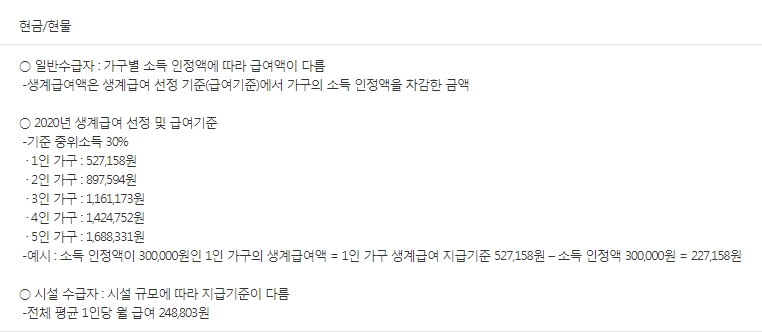 일반 수급자는 가구별 소득 인정액에 따라 급여액이 달라지며 생계급여액은 생계급여 선정 기준에서 가구의 소득 인정액을 차감한 금액입니다.