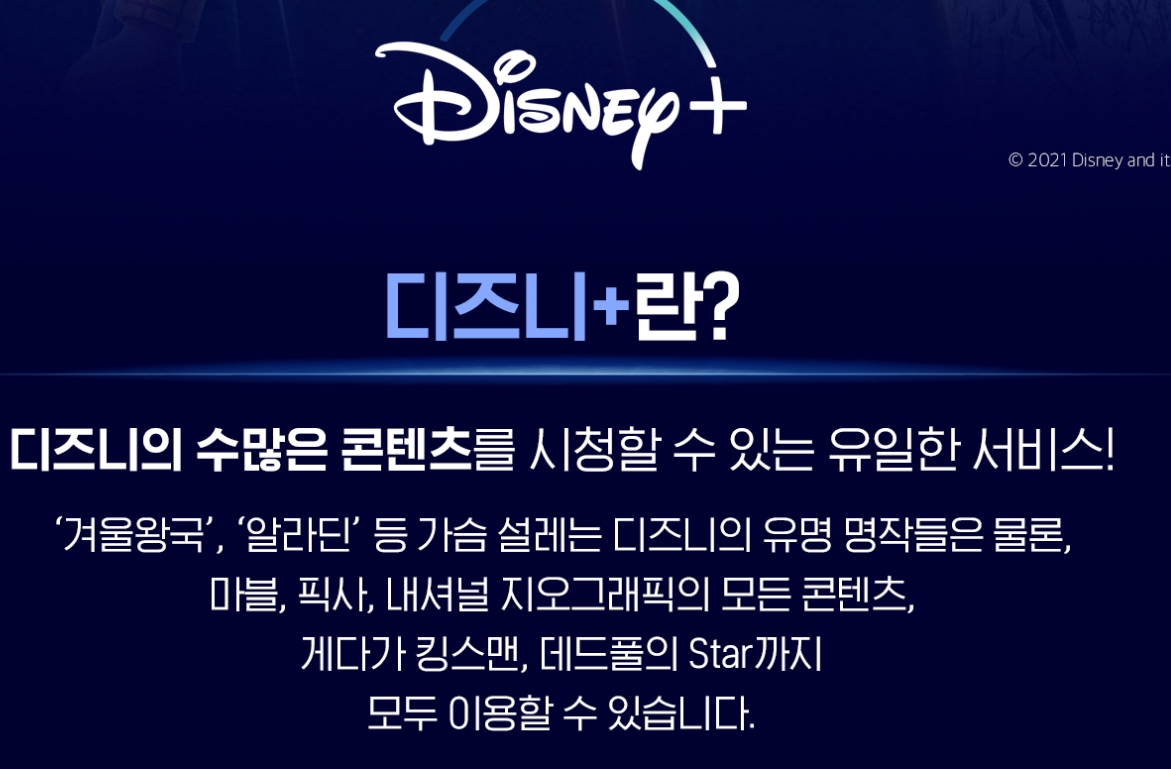 대표적인 예로 디즈니플러스 통해 픽사와 마블, 스타워즈, 내셔럴지오그래픽, 를 비롯해 강다니엘의 너와 나의 경찰수업, 정해인과 블랭핑크 지수가 주연한 설강화, 강풀작가의 원작 웹툰 무빙, 등의 컨텐츠도 볼 수 있습니다.