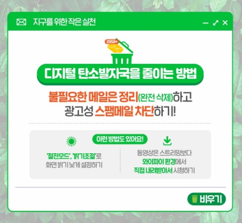 이 디지털 탄소 발자국을 줄이자는 것이 디지털 탄소 다이어트입니다. 이 방법이란 것은 그리 어렵지 않습니다. 메일함 관리만 잘하셔도 조금의 탄소발자국을 줄일 수 있습니다. 다시 보지 않을 메일을 삭제하고, 스팸 메일은 미리미리 차단하는 등의 간단한 클릭 한두번이면 됩니다.