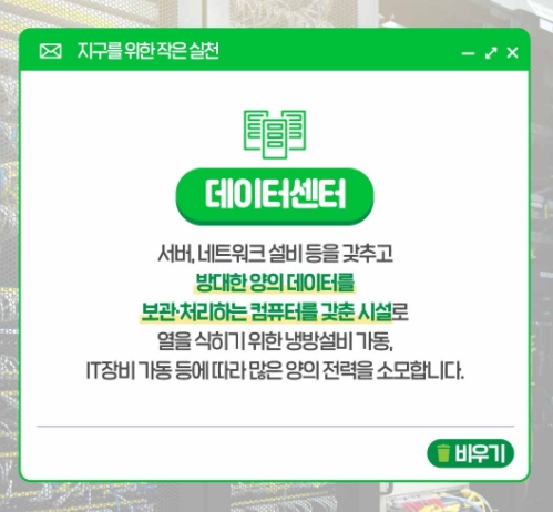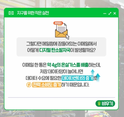 대표적인 디지털 탄소 다이어트 방법은 여러분들의 메일함을 비워 주시는 것입니다. 특히 읽지 않고 그냥 쌓여만 가고 있는 그 메일을 삭제시키는 것입니다. 그 메일을 저장하는 것이 단순하게 내 컴퓨터가 아닙니다. 그를 저장해두기 위해 데이터센터의 서버는 엄청난 에너지를 소비해야 합니다.