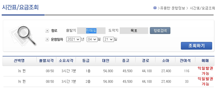 만재도에서 목포 가는 길은 4월24일 기준으로 오전 8시 50분에 출발하며 가격은 어른 54,800원, 어린이 44,100원, 경로 44,100원입니다.