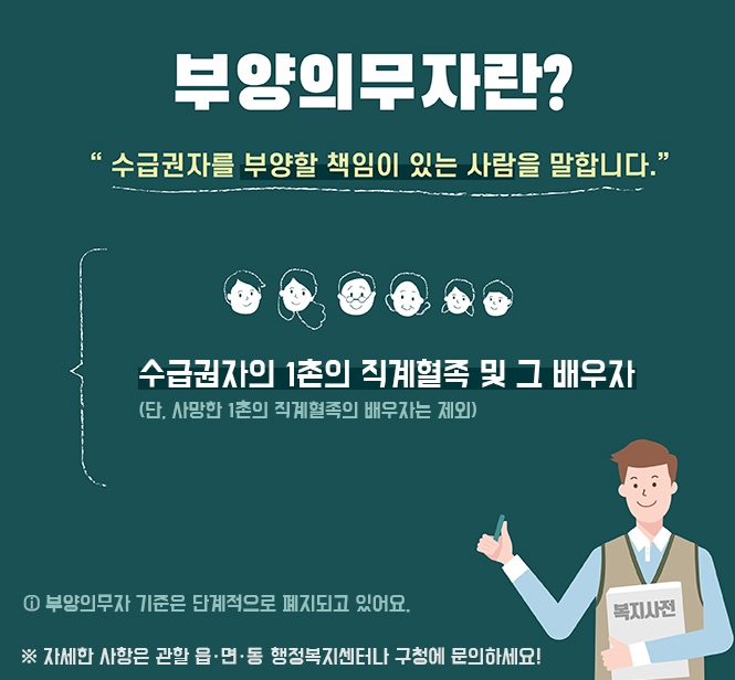 생계급여와 의료급여에는 부양의무자 기준이 있으며 주거급여와 교육급여에는 부양의무자 기준이 적용되지 않습니다. 여기서 말하는 부양의무자란 수급권자를 부양할 책임이 있는 사람이며 수급권자의 1촌의 직계혈족 및 그 배우자가 이에 해당됩니다. 다만 사망한 1촌의 직계혈족의 배우자는 제외됩니다.