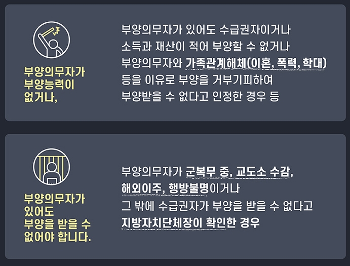 부양의무자 기준 충족이 안되는 경우는 부양의무자가 없거나 있다고 해도 수급권자이거나 소득과 재산이 적어서 부양할 수 없거나 가족관계 해체 등으로 부양을 거부 기피해서 부양받을 수 없다고 인정하는 경우, 부양의무자가 군복무 중, 교도소 수감, 해외이주, 행방불명 등의 이유로 부양을 받을 수 없어야 합니다.