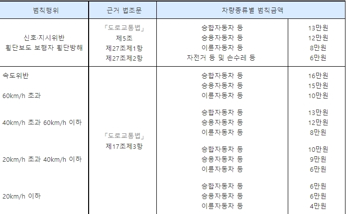 어린이 보호구역 신호위반 범칙금 및 과태료
