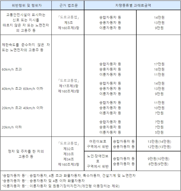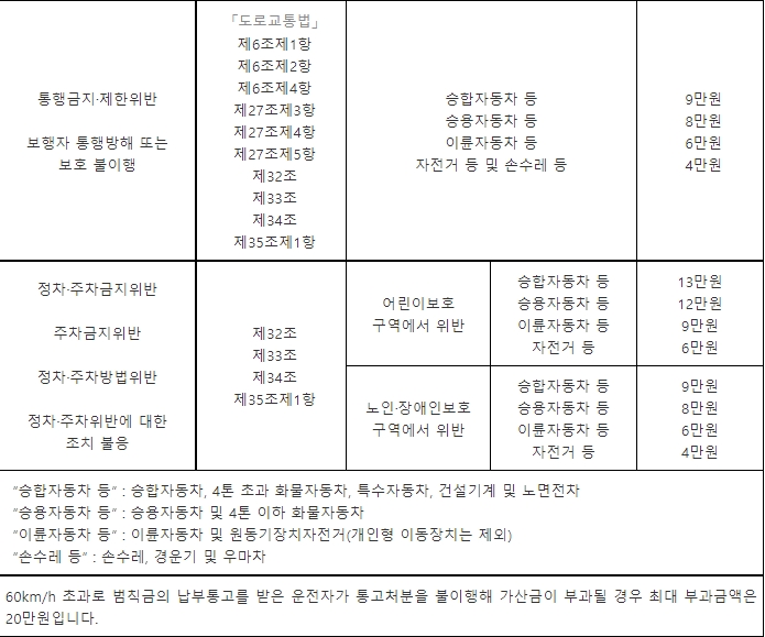 주정차 위반의 경우는 일반도로가 4만원인데에 반해 12만원이며 속도위반의 경우는 20km이하는 일반도로 3만원, 보호구역 6만원, 20~40km 이하는 6만원과 9만원, 40~60km 이하는 9만원과 12만원, 60km이상인 경우는 12만원, 15만원의 범칙금이 부과됩니다.