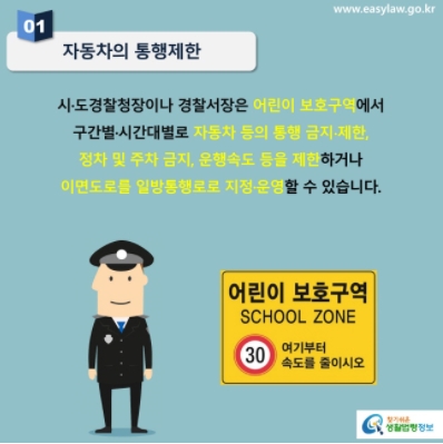 이 구역 내에서는 시속 30km 이내로 제한됩니다. 이는 초등학교, 유치원 등 어린이 보호구역내 학교의 주 출입문에서 반경 300m 이내가 주로 구역 내에 들어가게 되는데 여기서 속도 또는 여러가지 신호 위반을 하면 과태료 부과대상이 됩니다.