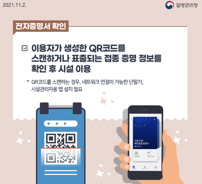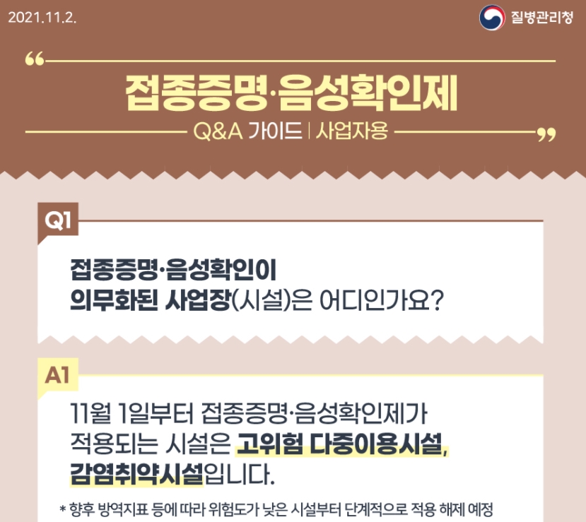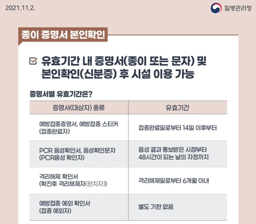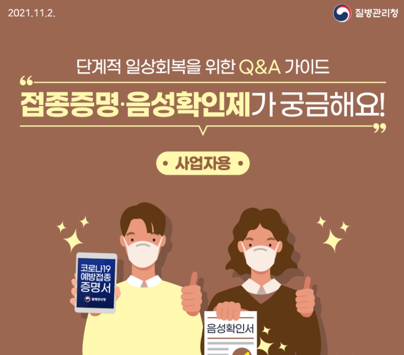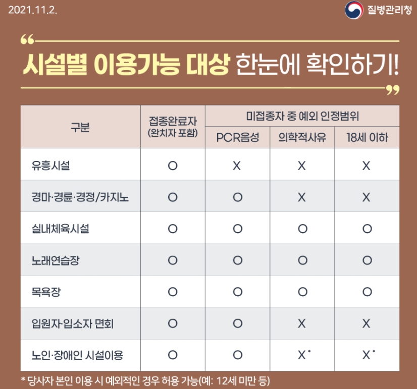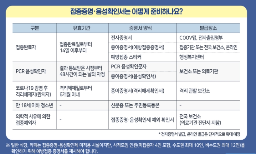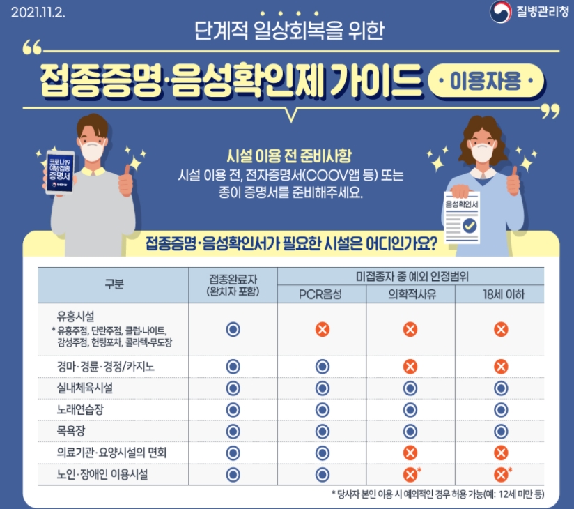 또한 입원자와 입소자의 면회와 노인, 장애인 시설 이용하기 위해서도 완치자 포함한 접종완료자와 PCR검사 음성확인서 필요하게 됩니다.