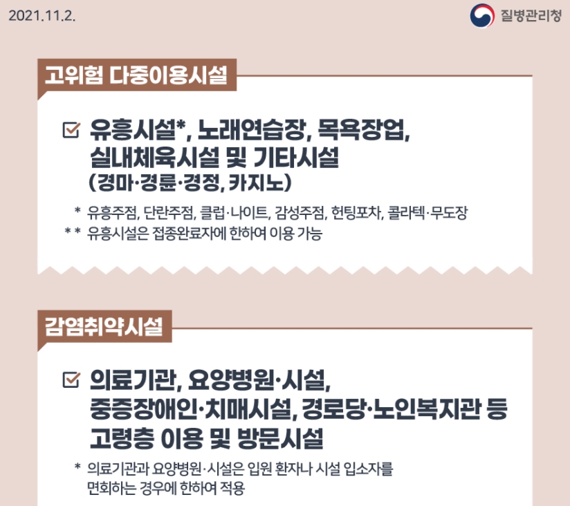 유흥시설에서는 접종완료자, 완치자가 이용할 수 있습니다. 미접종자의 경우는 어떤 상황에서도 인정되지 않습니다. 유흥시설에는 유흥주점과 단란주점, 클럽, 나이트, 감성주점, 헌팅포차, 콜라텍, 무도장 등이 해당됩니다.