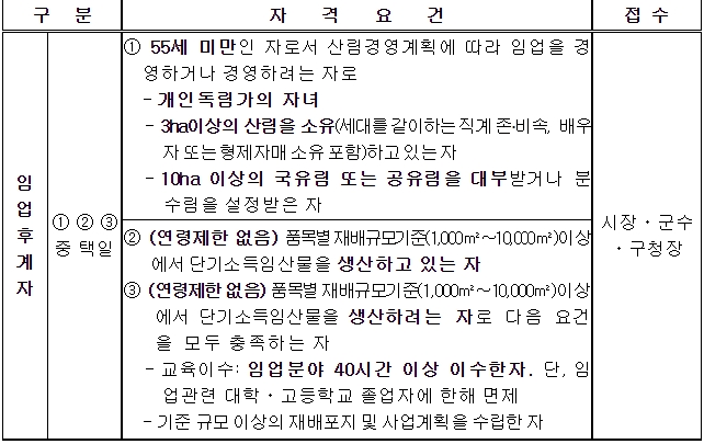 세분화 되어 있는 임업후계자 자격요건은 위의 표를 참고하시면 됩니다. 산림사업용 종자 또는 산림용 묘목 / 수실류 / 버섯류 / 산나물류 / 약초류 / 수목부산물류 / 관상산림식물류 / 그밖의 임산물 등으로 구분되어 있습니다.