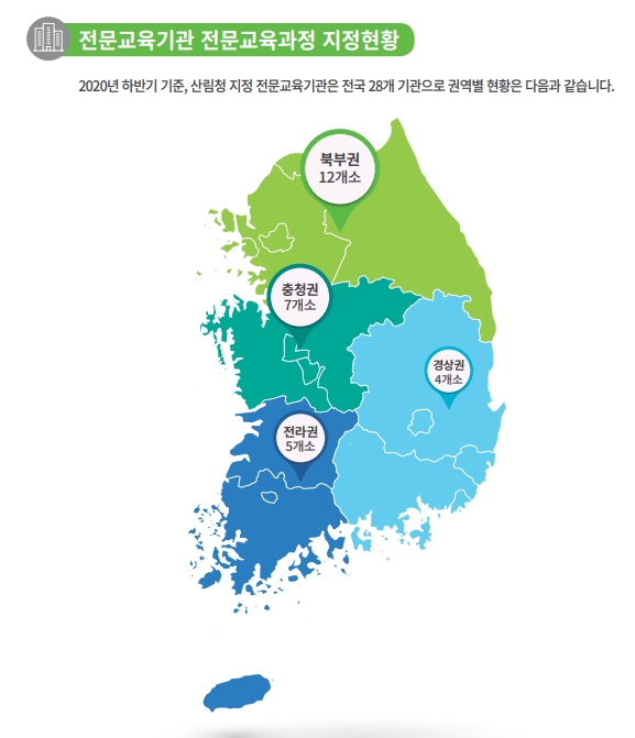북부권 12개소, 충청권 7개소, 전라권 5개소, 경상권 4개소입니다. 각각의 전문교육기관에서는 여러가지 임업 관련 교육을 하고 있습니다. 또한 각 기관에 따라서 교육내용 뿐만 아니라 교육생 선발 방법이 상이할 수 있으므로 직접 교육기관에 문의를 해 보시는 것이 빠릅니다.