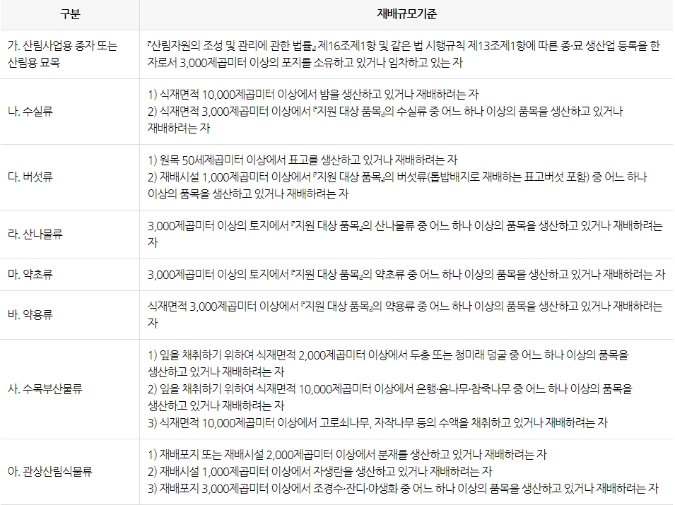기본적인 임업후계자 자격요건은 위의 세가지 항목 중 하나에 해당되면 됩니다. 하지만 여기에 충족해도 각각의 임산물 소득원 품목별로 또다시 세분화 되어 있습니다.
