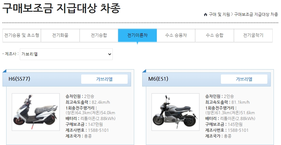물론 전국에서 다 정부 보조금 받을 수 있는 것은 아닙니다. 각 지자체별로 한정된 예산 내에서 선착순 지급되는 것을 잊지말고 미리미리 확인해 두셔야 합니다. 그리고 전기오토바이 기종마다 정부 보조금 지원금액 또한 다릅니다.