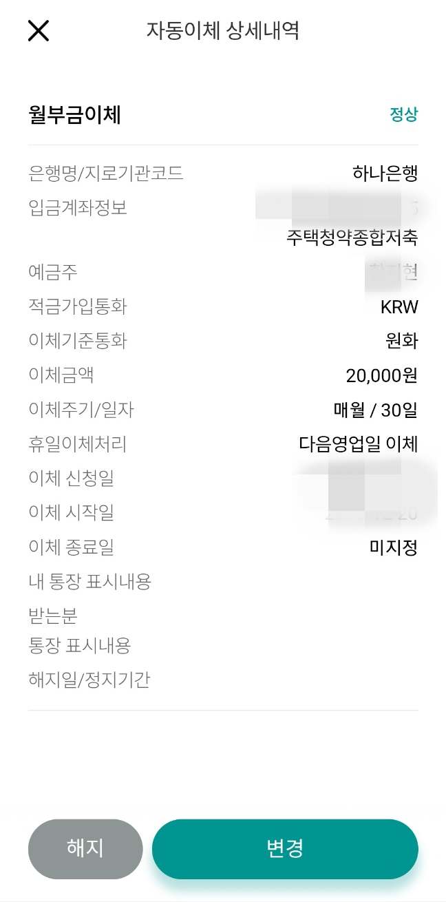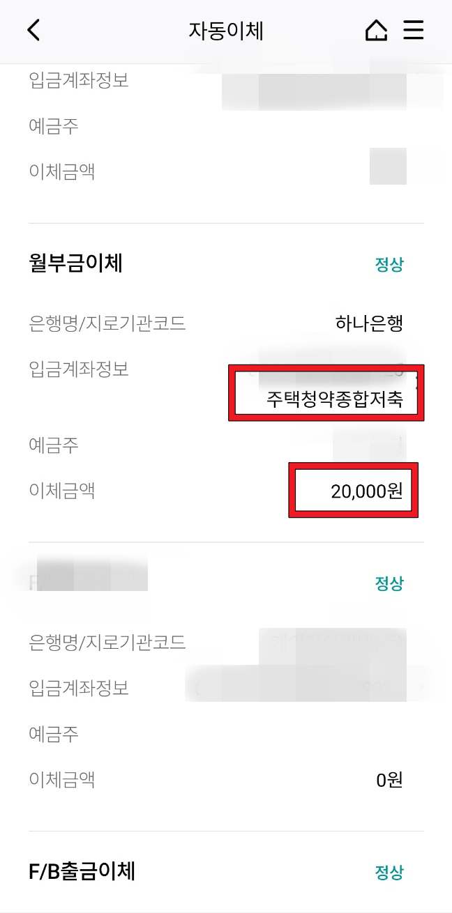 자동이체 목록에서 주택청약종합저축 등 청약 관련 메뉴를 선택합니다. 저는 한달에 20,000원씩 이체 하고 있고 한번도 미납된 적 없이 꼬박꼬박 납입되고 있습니다.