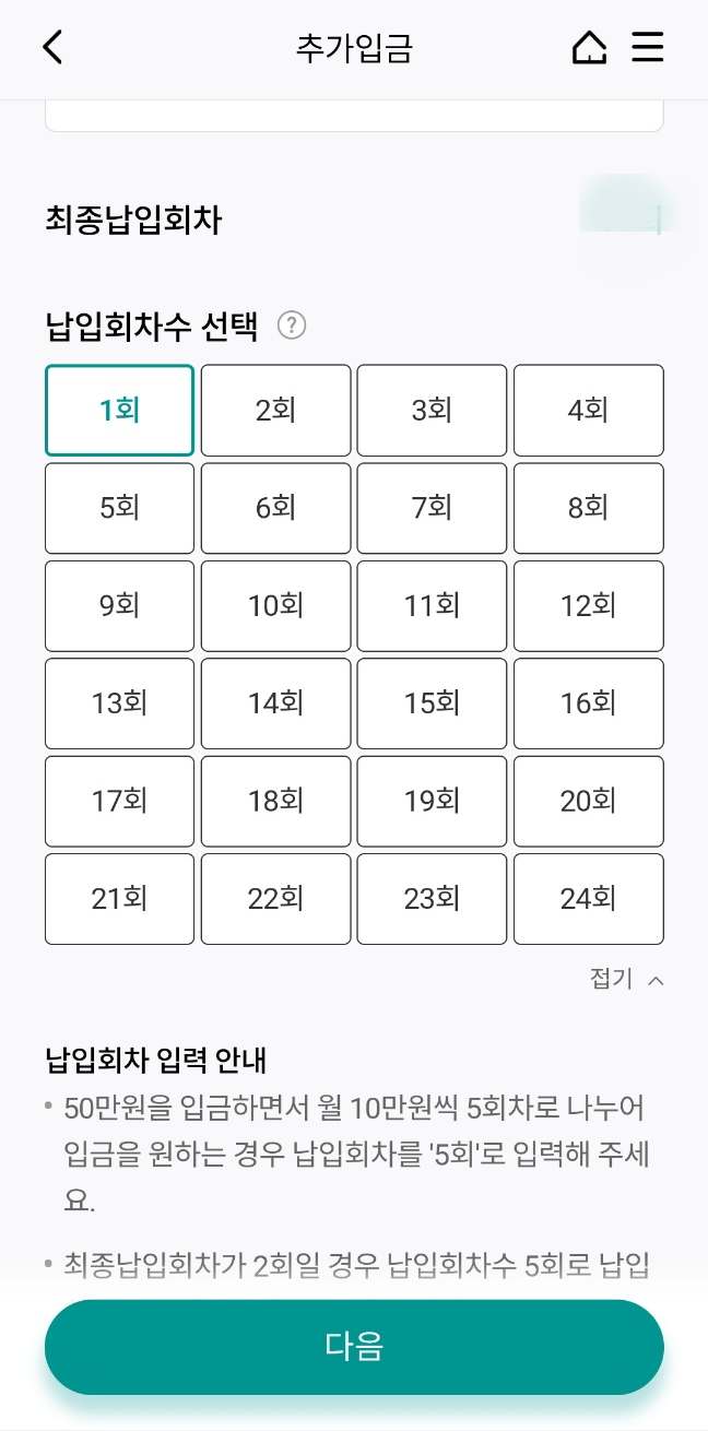 지금 당장 어떻게 해 볼 생각이 있는 것은 아니지만 주택청약 하거나 할 때 이 납입회차수도 중요한 경우가 있다고 하던데 아무 생각없이 그냥 1회차로 납입해 버렸습니다. 여러분들은 청약 금액 변경 또는 미납금액 입금이나 추가입금 하면서 이렇게 실수하지 않도록 하세요.