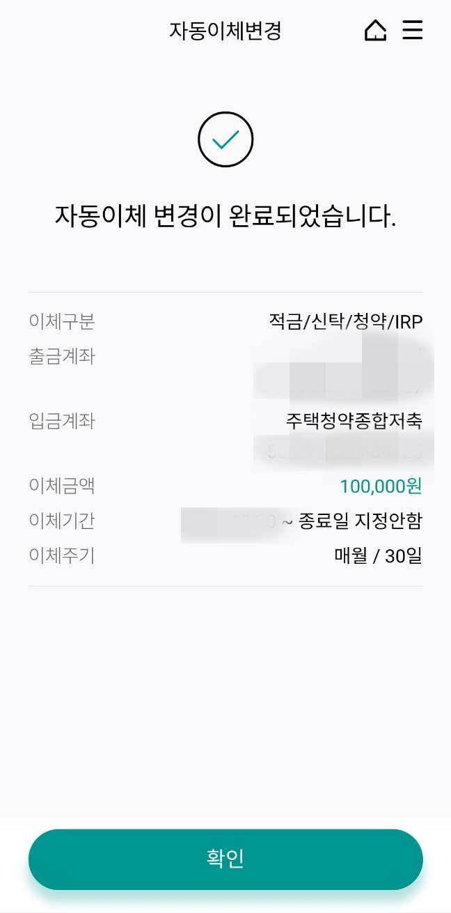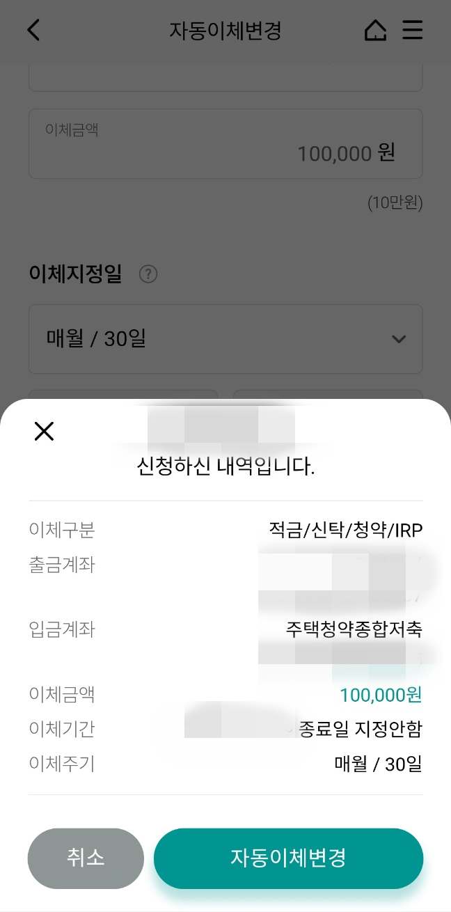 자동이체 변경내용은 신청한 날짜 현재일에 +1영업일로 반영되어 진행되므로 내일부로 청약 금액 변경 반영될 것입니다.