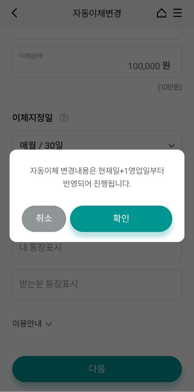 자동이체 항목에서 주택청약 메뉴를 선택해 이체 금액 적혀 있는 부분을 선택해서 변경 하려는 금액으로 적어 주시면 됩니다. 저는 금액 변경만 하고 이체 지정일이나 종료일 지정 등은 따로 손대지 않았습니다. 다음을 누릅니다.
