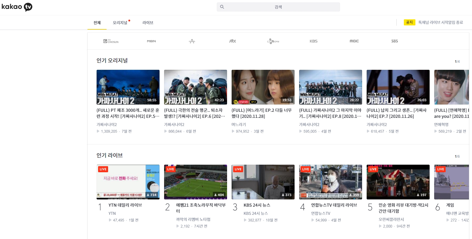 포털사이트에서 카카오티비 검색하면 바로 카카오TV사이트로 들어갈 수 있습니다. 홈페이지에서도 오리지널과 라이브로 나뉘어져 있고 전체를 다 한번에 확인할 수도 있습니다. 요즘 인기있는 며느라기 등을 보고 싶다면 오리지널 선택하면 됩니다.