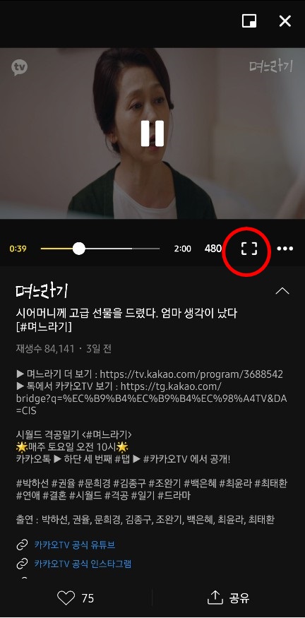 카카오톡에서 카카오티비 보는법 워낙 간단하기 때문에 원하는 프로그램은 그냥 다 보실 수 있습니다. 전체화면으로도 보실 수 있으니 버스안에서나 침대 위에서 아주 편한 상태에서 볼 수 있습니다.