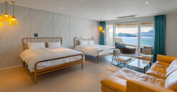 코모힐 객실과 코모밸리는 커플에 최적화된 공간 구성이 돋보이는 객실이며 루프탑 수양장에서의 오션뷰가 일품입니다. 기준 2명에 최대 4명, 퀸침대 1개가 마련되어 있습니다.